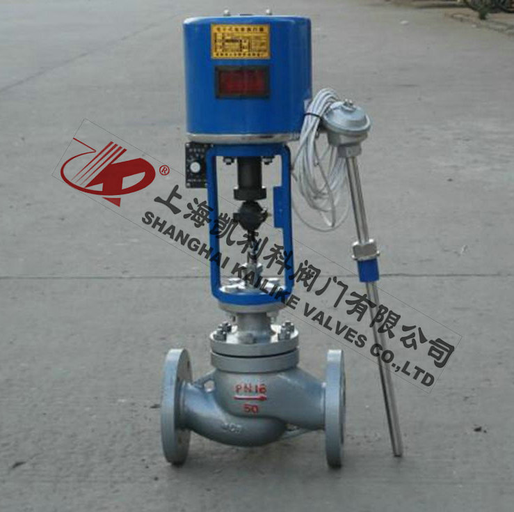 由單座調(diào)節(jié)閥、電動執(zhí)行機構(gòu)、溫度傳感器和溫度調(diào)節(jié)器等部件組成,根據(jù)用戶需要,分別有加熱型與冷卻型兩種結(jié)構(gòu)。加熱型調(diào)節(jié)閥的結(jié)構(gòu)與原理,工作前主閥芯處于半開位置,傳感器處于自然狀態(tài)。接上電源,主閥芯全開。介質(zhì)由箭頭方向流入主閥體、經(jīng)閥芯對儲熱箱進行加熱。當(dāng)溫度升到相應(yīng)設(shè)定值時,傳感器即產(chǎn)生相應(yīng)線性信號輸入一體化執(zhí)行機構(gòu),隨即驅(qū)動閥桿、閥芯產(chǎn)生位移,關(guān)閉主閥芯停止加熱。當(dāng)溫度低于設(shè)定值時,傳感器即產(chǎn)生線性信號輸入一體化執(zhí)行機構(gòu),驅(qū)使閥芯漸開,使介質(zhì)按拋物線特性流入儲熱箱,進行加熱直至設(shè)定值。這樣被控介質(zhì)始終在設(shè)定溫度范圍內(nèi)被控制,從而達到控溫目的。